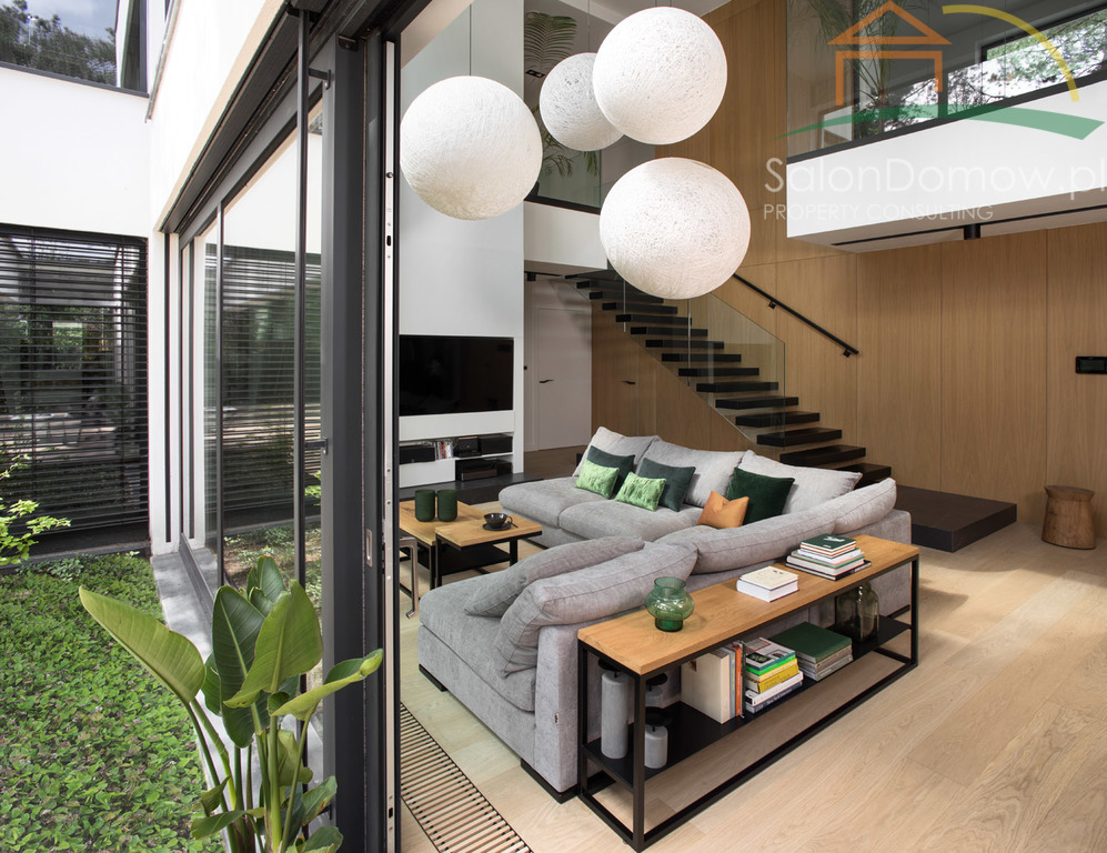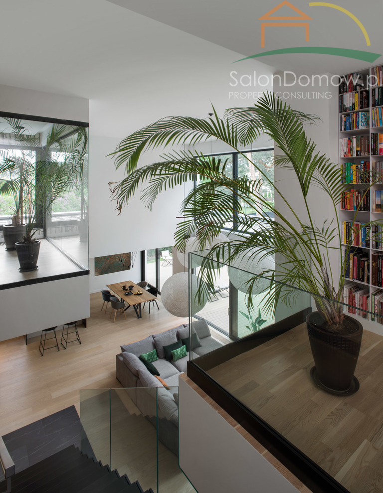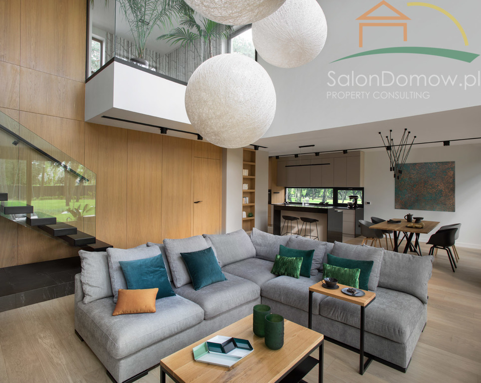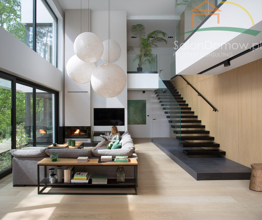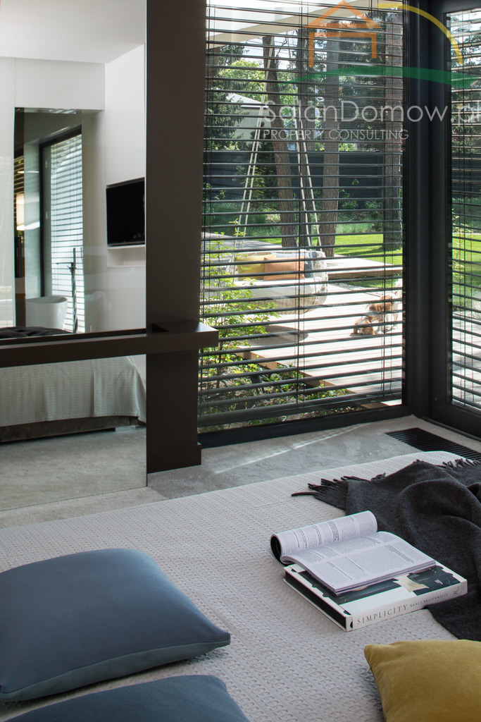 imponujący otwarty salon z kominkiem i schodami półkowymi o pow. około 40 m2 m2 i wysokości 6,90 cm, przeszklony na całej wysokości z wyjściem poprzez okna typu HS na 120 m2 taras, połączony z kuchnią i jadalnią o pow. 30 m2 (- kompletny wysokiej klasy sprzęt AGD wraz expresem do kawy). Wejścia do domu przez obszerny hall, z salonu przejście do głównej, oddzielnej sypialni typu studio, połączonej z łazienką i garderobą (instalacja pod klimatyzację, nagłośnienie, automatyczne firany) - łącznie około 34 metrów2. Duże przesuwne okno typu HS z widokiem na ogród. Sypialnia jest odrębną częścią domu, dzięki temu zapewnia gospodarzom prywatną strefę odpoczynku i relaksu. Na parterze znajduje się pokój gościnny o pow. 11,5 m2 oraz ogólno dostępna łazienka z dodatkowym prysznicem. Garaż na dwa samochody o powierzchni 45 m2 wyłożony dużymi płytkami z gresu gdzie część fug zastępuje oświetlenie LED, tworzy niepowtarzalny motoryzacyjny klimat.