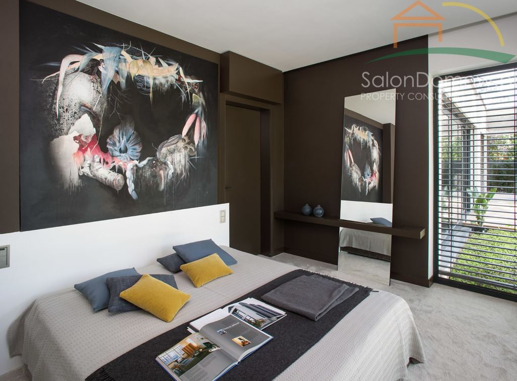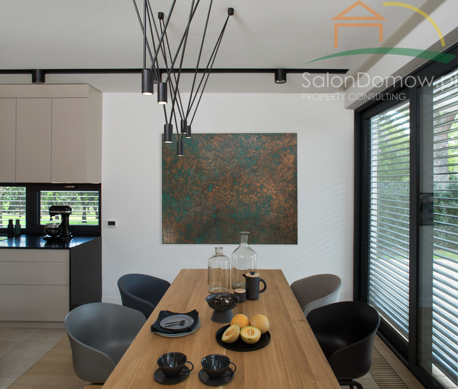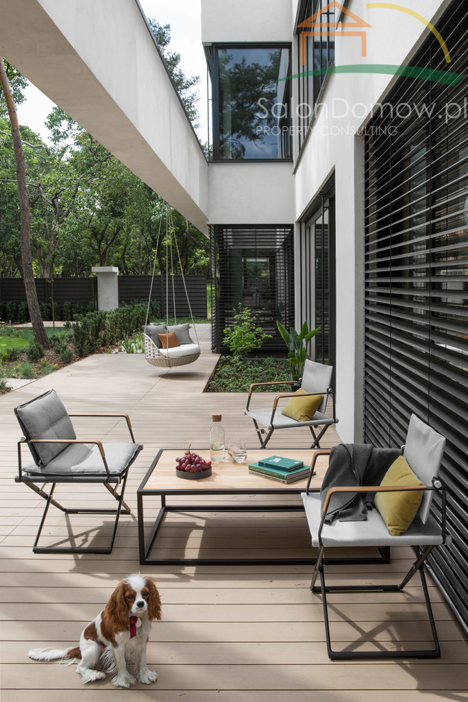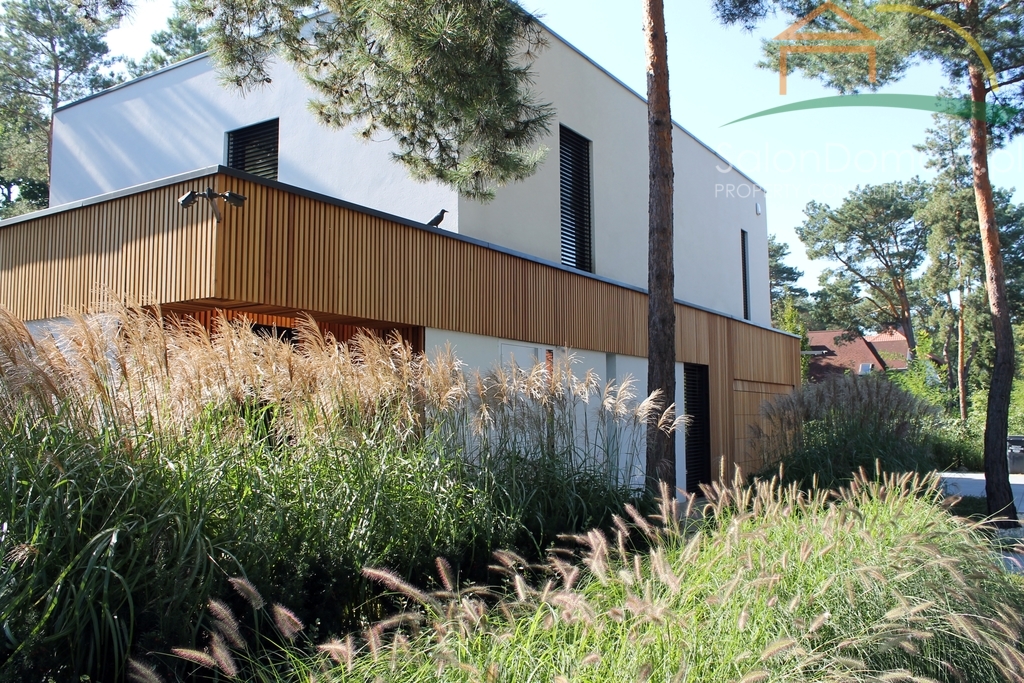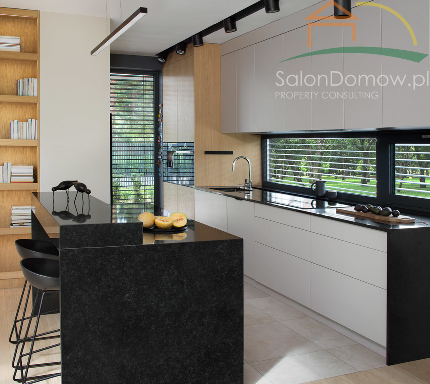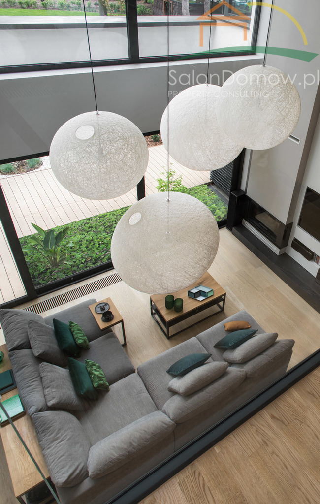imponujący otwarty salon z kominkiem i schodami półkowymi o pow. około 40 m2 m2 i wysokości 6,90 cm, przeszklony na całej wysokości z wyjściem poprzez okna typu HS na 120 m2 taras, połączony z kuchnią i jadalnią o pow. 30 m2 (- kompletny wysokiej klasy sprzęt AGD wraz expresem do kawy). Wejścia do domu przez obszerny hall, z salonu przejście do głównej, oddzielnej sypialni typu studio, połączonej z łazienką i garderobą (instalacja pod klimatyzację, nagłośnienie, automatyczne firany) - łącznie około 34 metrów2. Duże przesuwne okno typu HS z widokiem na ogród. Sypialnia jest odrębną częścią domu, dzięki temu zapewnia gospodarzom prywatną strefę odpoczynku i relaksu. Na parterze znajduje się pokój gościnny o pow. 11,5 m2 oraz ogólno dostępna łazienka z dodatkowym prysznicem. Garaż na dwa samochody o powierzchni 45 m2 wyłożony dużymi płytkami z gresu gdzie część fug zastępuje oświetlenie LED, tworzy niepowtarzalny motoryzacyjny klimat.