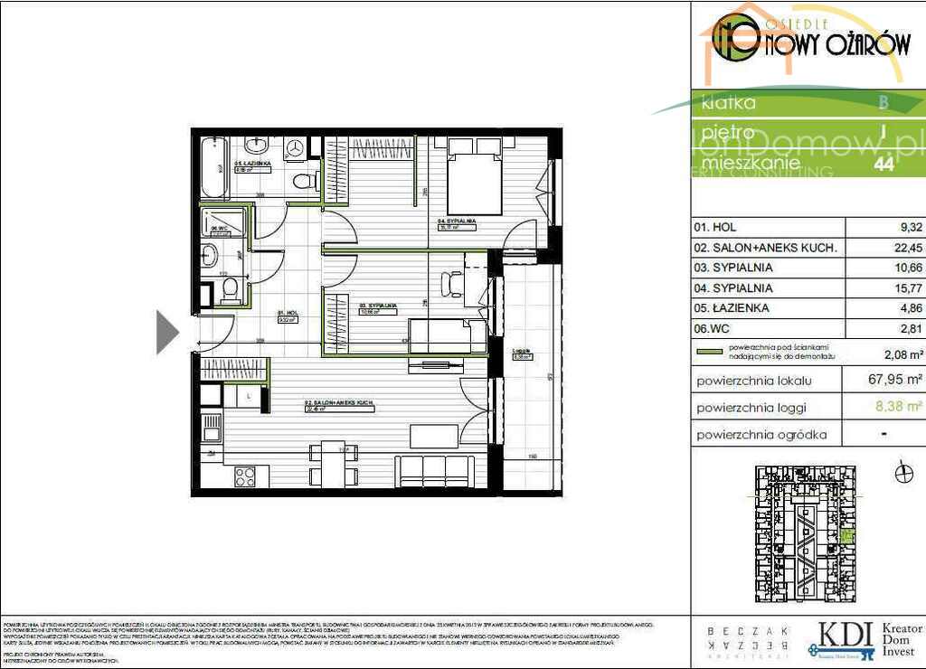 Trzy pokojowe mieszkanie o pow. 67,99 m2 w stanie developerskim z dużym 49,85m2 ogródkiem wewnątrz budynku oraz loggią o pow. 11,58 m2 na poziomie pierwszego piętra zlokalizowane w nowej inwestycji Nowy Ożarów przy ul. Nadbrzeżnej 35. Projekt nieruchomości bazuje na przemyśleniach architektonicznych, dzięki czemu mieszkanie jest komfortowe i funkcjonalne. Trzy piętrowy niski budynek z windą i podziemnym garażem składa się ze 129 mieszkań i 11 lokali usługowych. Mieszkanie jest wysokie 2,9, posiada wysokie okna, przynależą do niego dwa miejsce w garażu podziemnym (płatne dodatkowo 35 tys zł za jedno), i komórka lokatorska na poziomie 0 (płatna dodatkowo 15 tys zł).