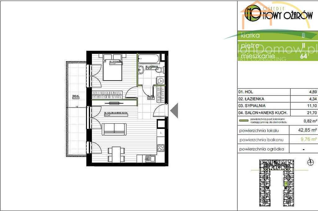 NOWE 2- pokojowe mieszkanie o pow. 42,85 m2 wykończone pod klucz, zlokalizowane w nowej inwestycji Nowy Ożarów przy ul. Nadbrzeżnej 35. Projekt nieruchomości bazuje na przemyśleniach architektonicznych, dzięki czemu mieszkanie jest komfortowe i funkcjonalne. Trzy piętrowy niski budynek z windą i podziemnym garażem składa się ze 129 mieszkań i 11 lokali usługowych. Mieszkanie jest wysokie 2,9 , posiada wysokie okna, przynależy do niego miejsce w garażu podziemnym (płatne dodatkowo 35 tys zł), miejsce postojowe przed budynkiem (płatne dodatkowo 18 tys żł) oraz komórka lokatorska na poziomie 0 (płatna dodatkowo 15 tys zł).