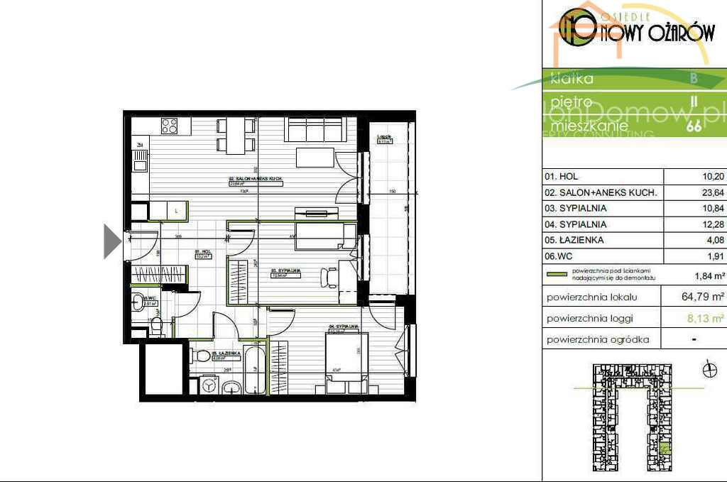 - Trzy pokojowe o pow. 64,79 m2 z loggią o pow 8,13 m2 w cenie 9900 zł za m2 - do mieszkania nie ma przewidzianego miejsca postojowego na zewnątrz budynku.